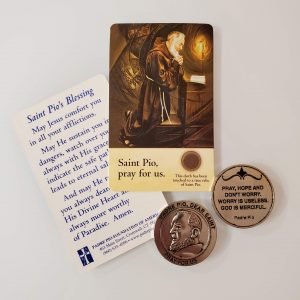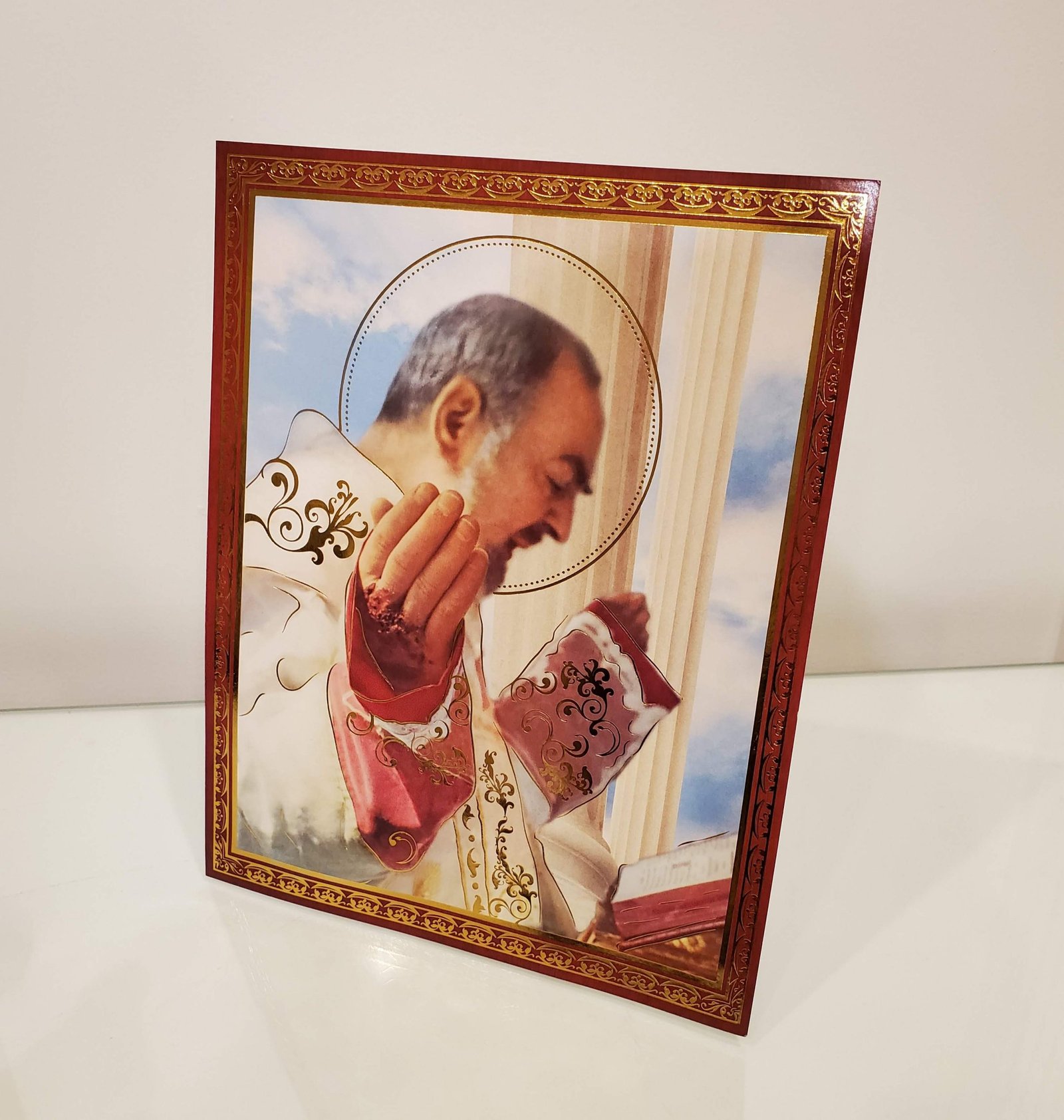 This beautiful picture of Padre Pio has gold embellishment around the image, as well as a folding stand on the back. Frame this beautiful picture, or rest it on any surface easily!