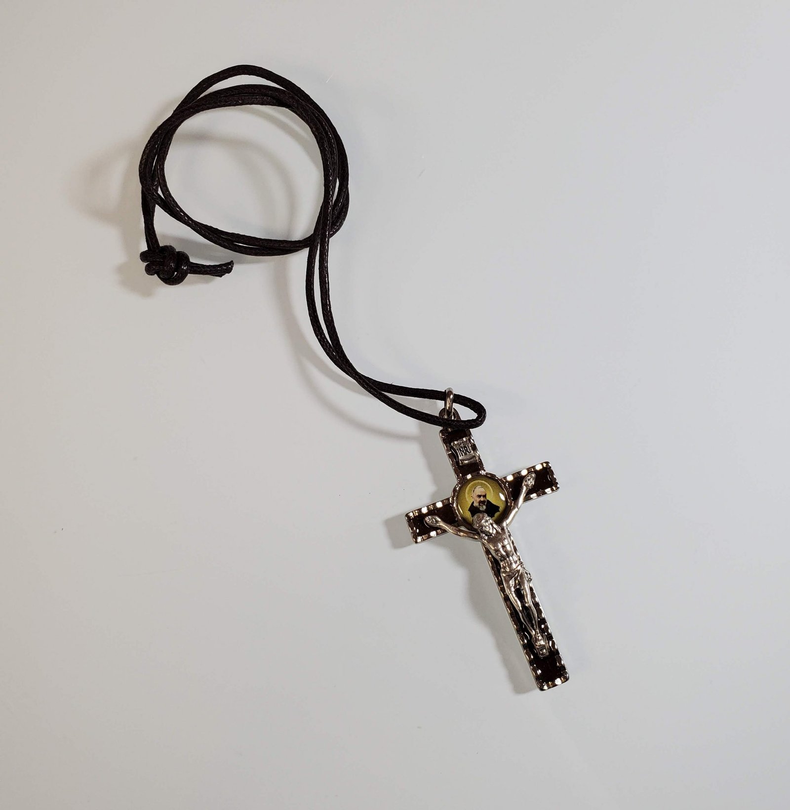 Beautiful 3" beveled Padre Pio Crucifix with silver corpus and brown enamel pendant with 24" brown cord.