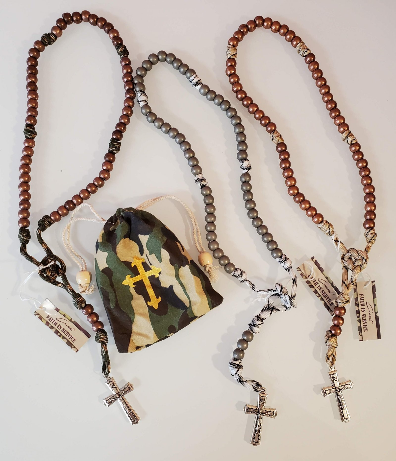 This military-inspired rosary remembers those who have served and continue to serve this beautiful nation. They're made from paracord with 10 mm beads ending with a silver plate crucifix. Each are packed for gifting in a camouflage pouch.