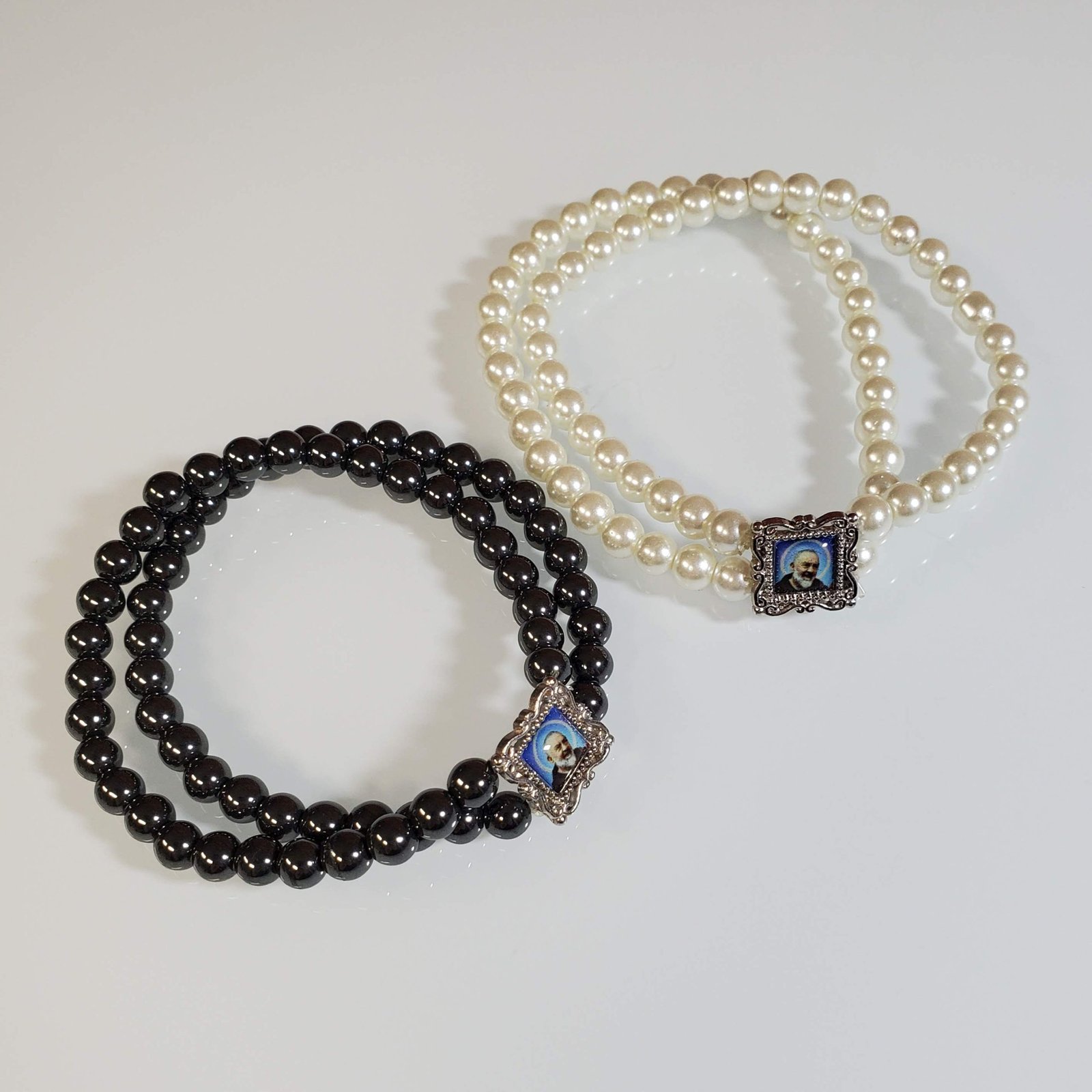 A beautiful bracelet with a square Padre Pio charm. Comes in hematite or faux pearl beads.
