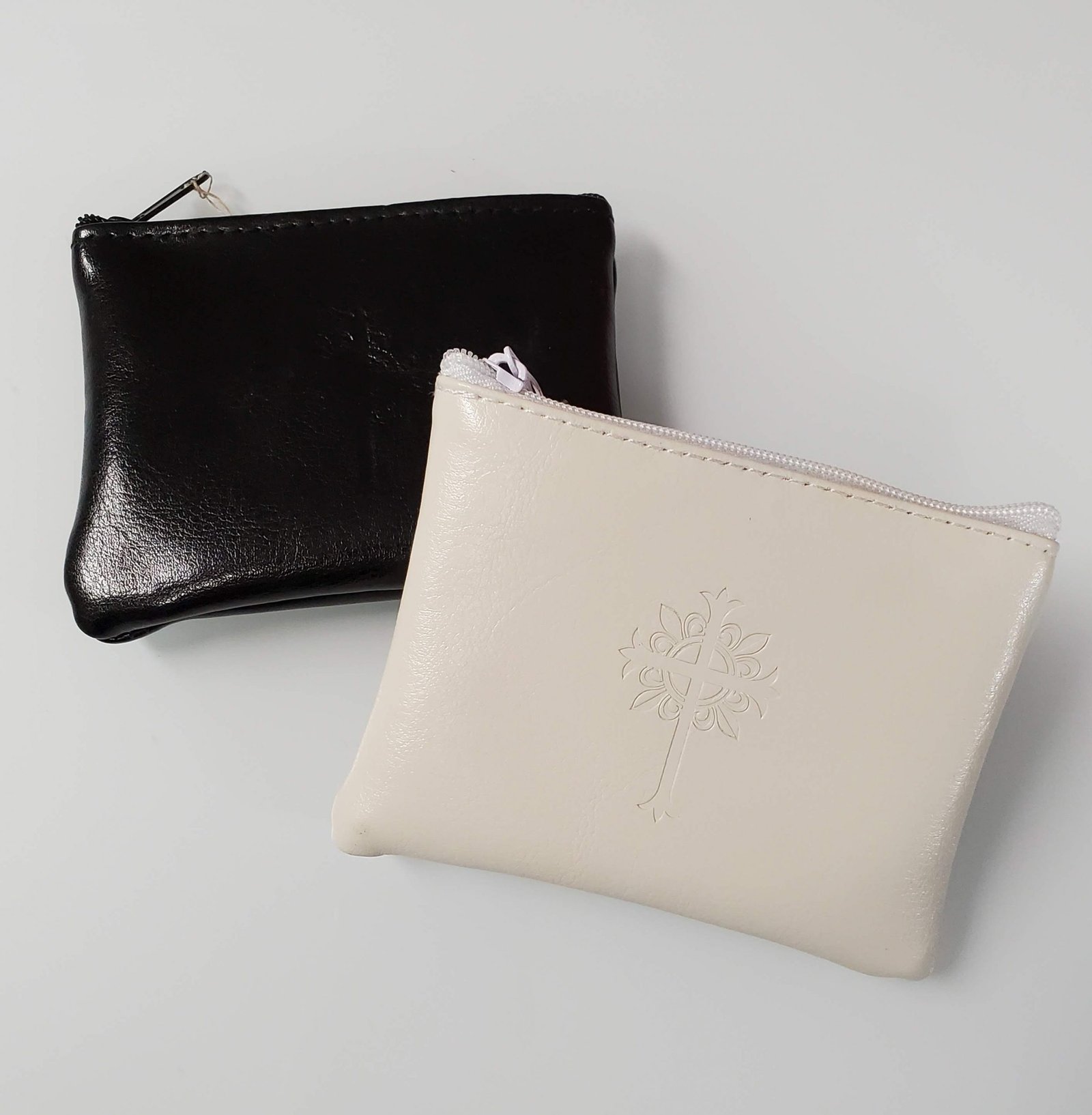 Protect your treasured prayer instrument in this rosary case made of genuine leather with embossed cross. This sturdy case will make carrying your rosary simple and eliminate tangles of the chain or beads. Comes in your choice of black or ivory.