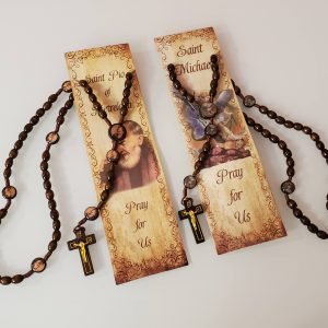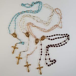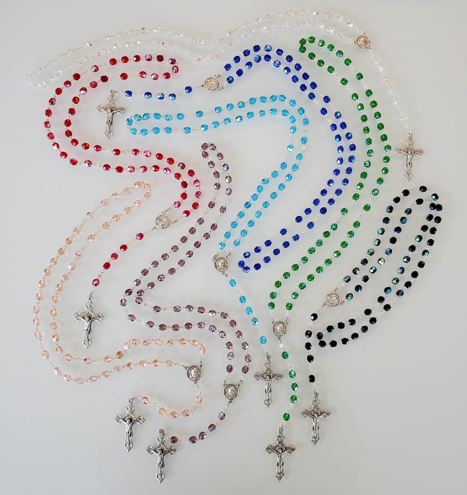 Handmade in Italy, these beautiful rosaries are lock linked for strength. The crucifix has a silver oxidized finish as does the centerpiece. On the back of the centerpiece is a third class relic of St. Pio. The beads are 7mm in size, made of glass, and have a polished facet with an aurora borealis finish. Available in 8 colors: Amethyst, Aqua, Rose, Clear, Blue, Red, Black and Green.