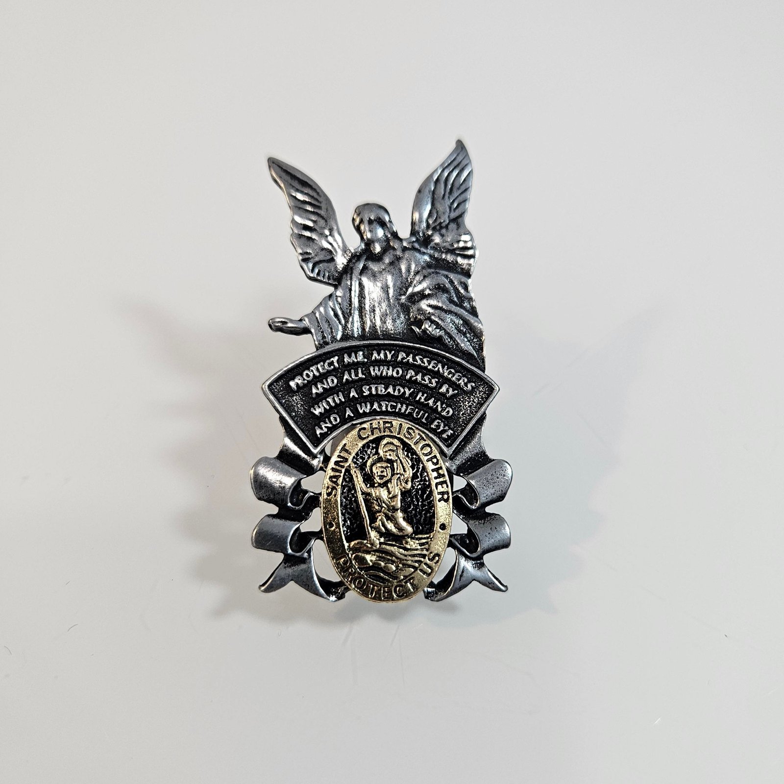 A vehicle visor clip with a Saint Christopher medal, and a Guardian Angel with the prayer “Protect me, my passengers, and all who pass by with a steady hand and a watchful eye.”