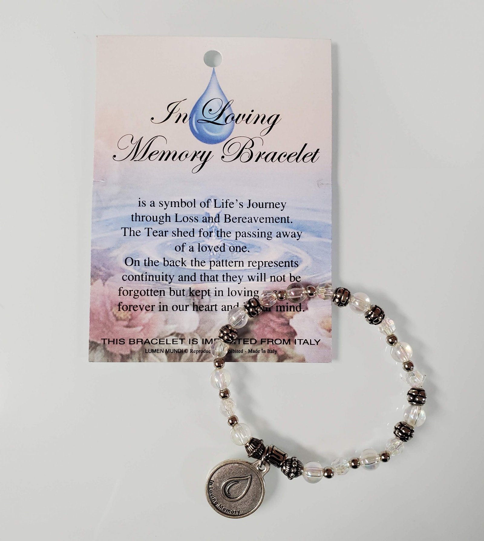 Iridescent and white beaded stretch bracelet with silver tone beads and tear drop medal. Comes on a prayer card with a simple but sweet message that explains the symbols on the charm.