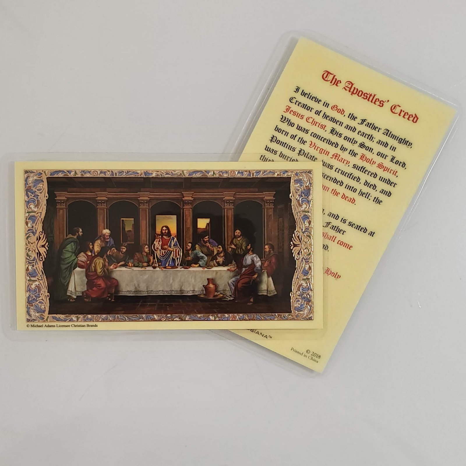Laminated prayer card featuring an artistic rendering of the last supper on the front and the Apostles Creed on the back.
