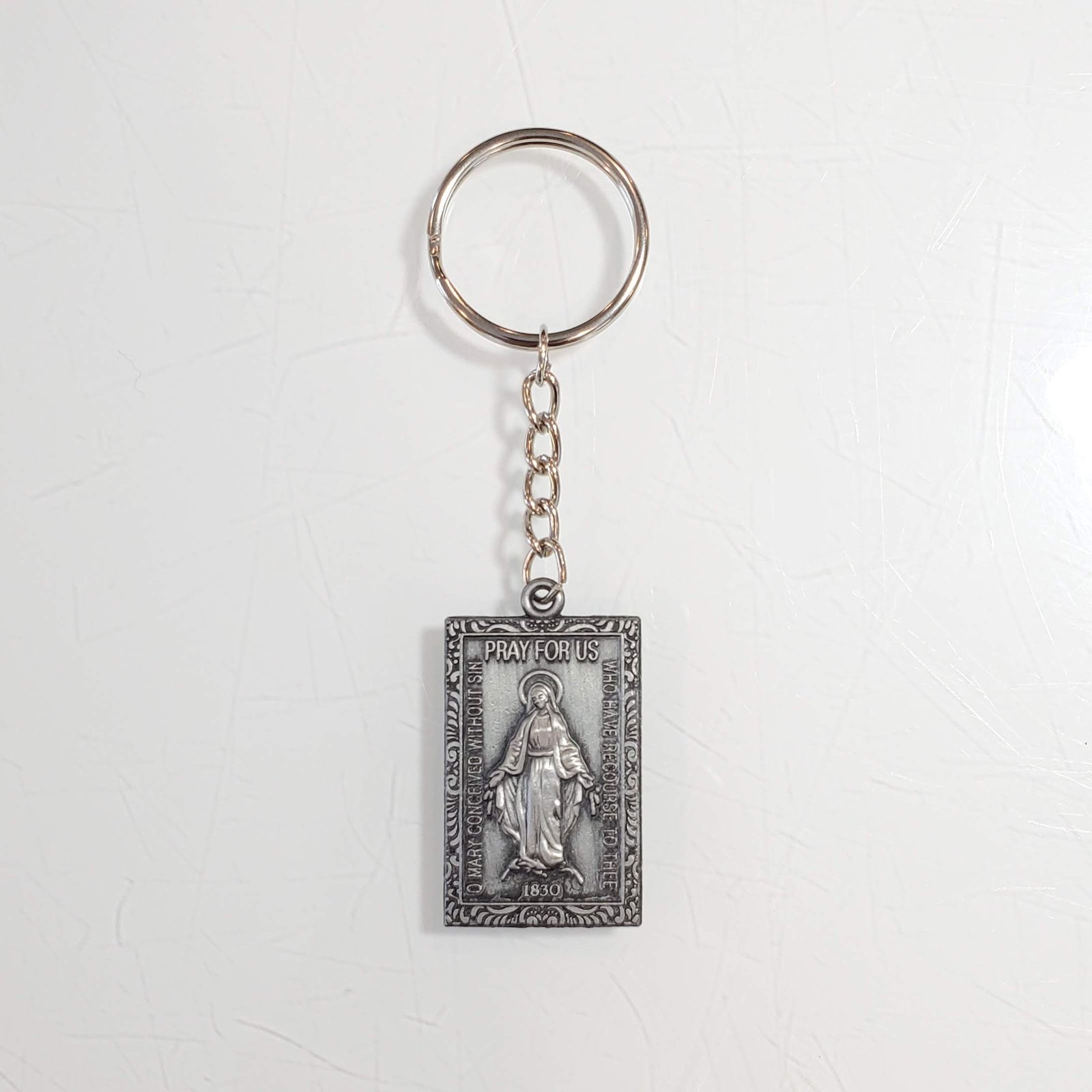 Our newest item! A silver colored rectangular double sided keychain featuring the beautiful Miraculous Medal image.