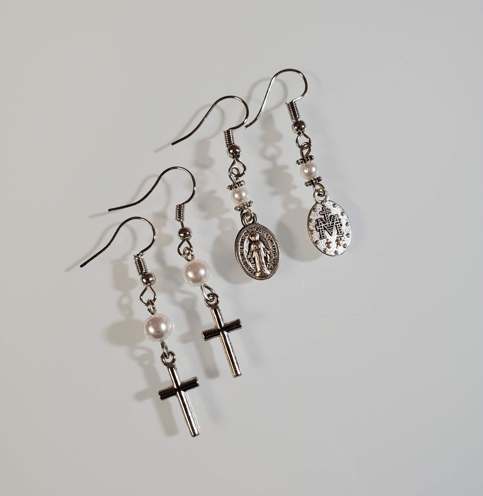 Beautiful silver tone pearl earrings that come in your choice of Miraculous Medal or cross styles.