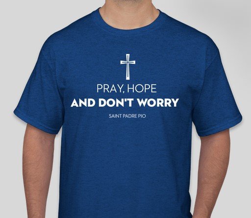 A tshirt designed just for you by the PPFOA! This beautiful dark blue shirt has Padre Pio's most famous saying "Pray, Hope and Don't Worry" across the chest.