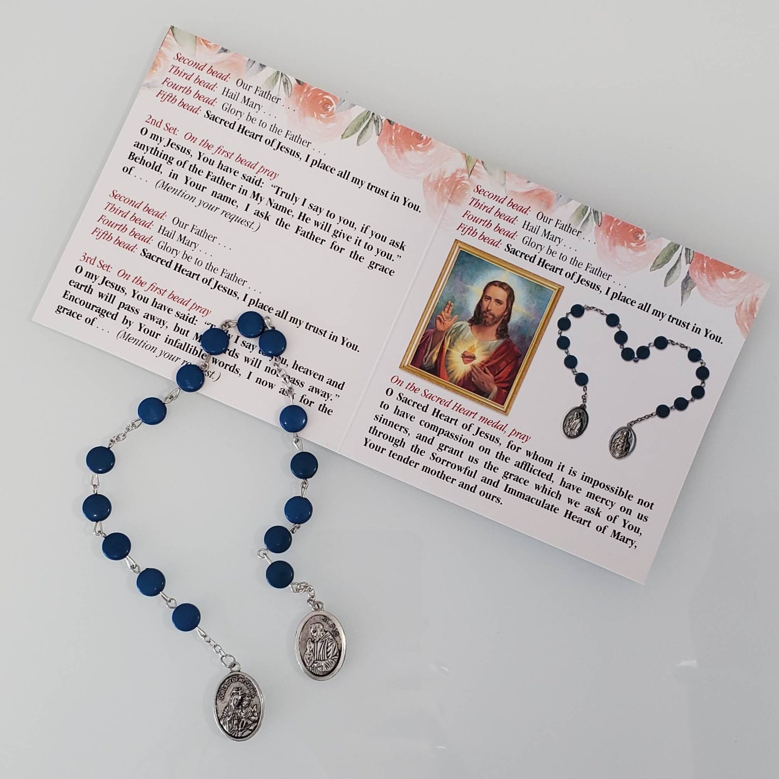 This new blue chaplet comes on a prayer card with the Efficacious Novena to the Sacred Heart of Jesus and is often called Padre Pio’s Novena because he prayed this prayer everyday. It is a nice devotional to always keep with you!