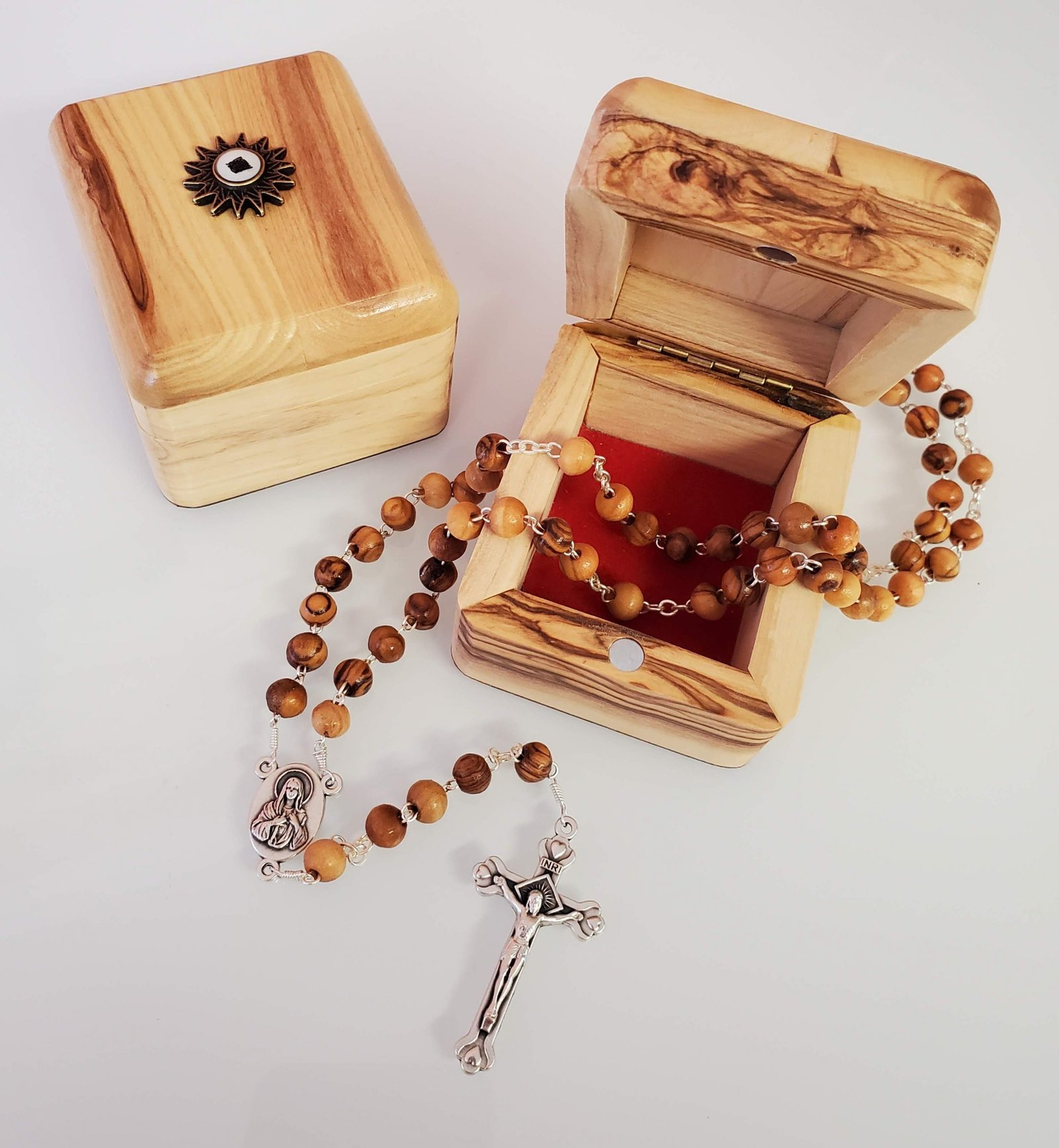 This Rosary and Rosary box set was made in the West Bank of Bethlehem. The relic box version was placed on top was touched to the tomb of Jesus.