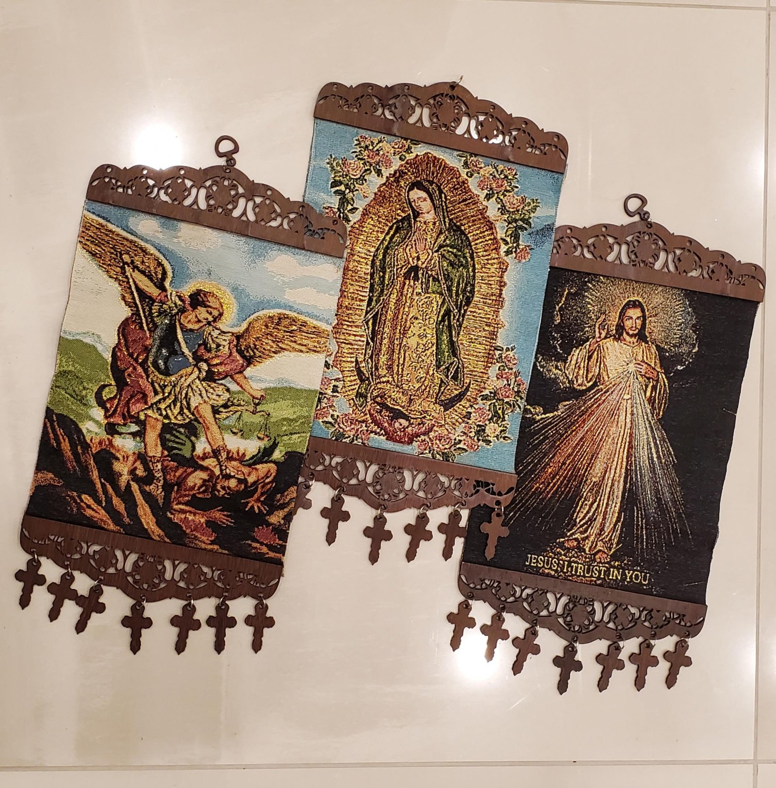 Each tapestry is expertly woven using traditional colors and gold accenting. Comes in your choice of Lady of Guadalupe or Saint Michael.