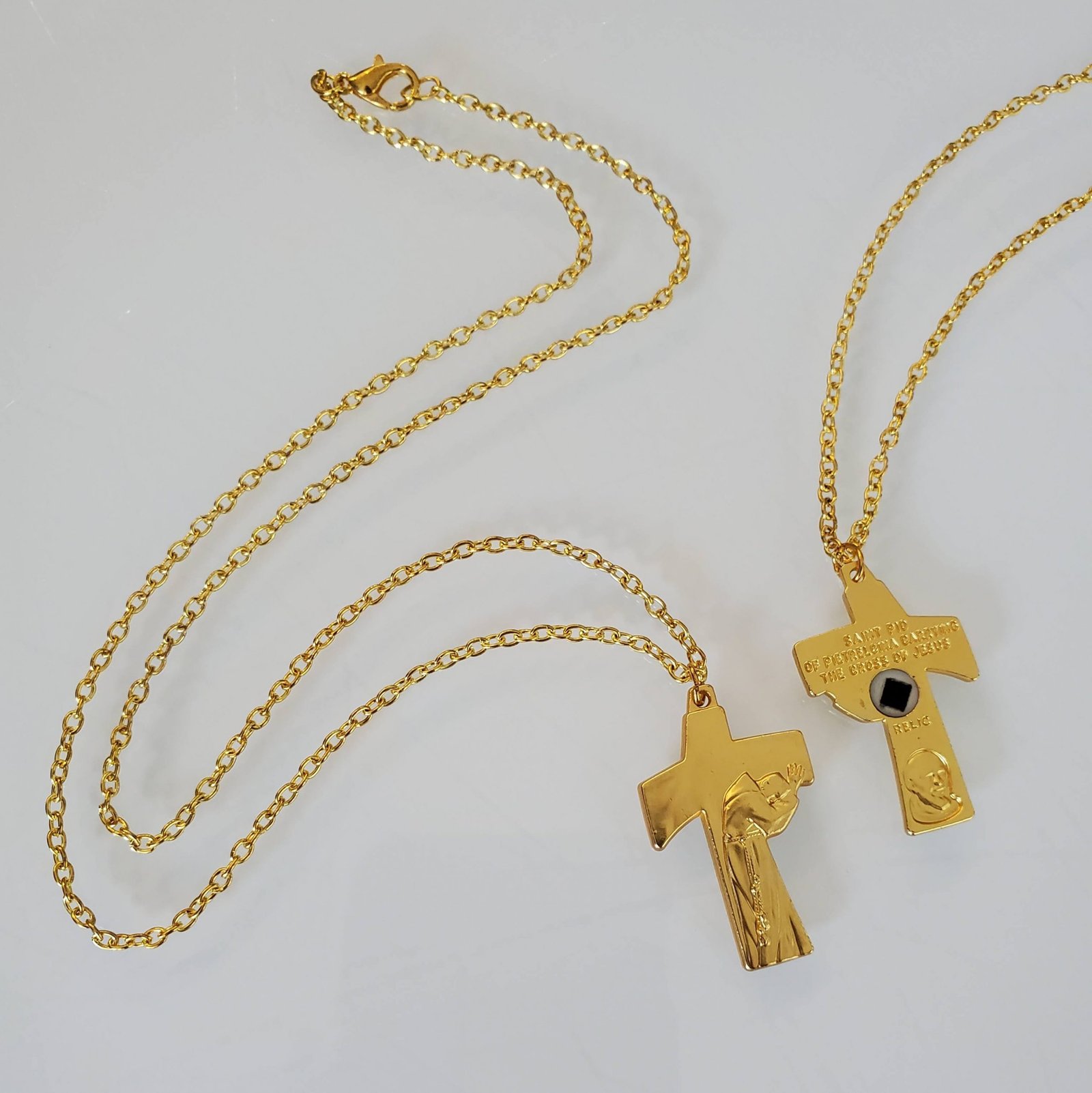 A beautiful gold-toned necklace and medal with an image of Padre Pio carrying Jesus’ cross on the front, and a third class relic and image of Saint Pio on the back.