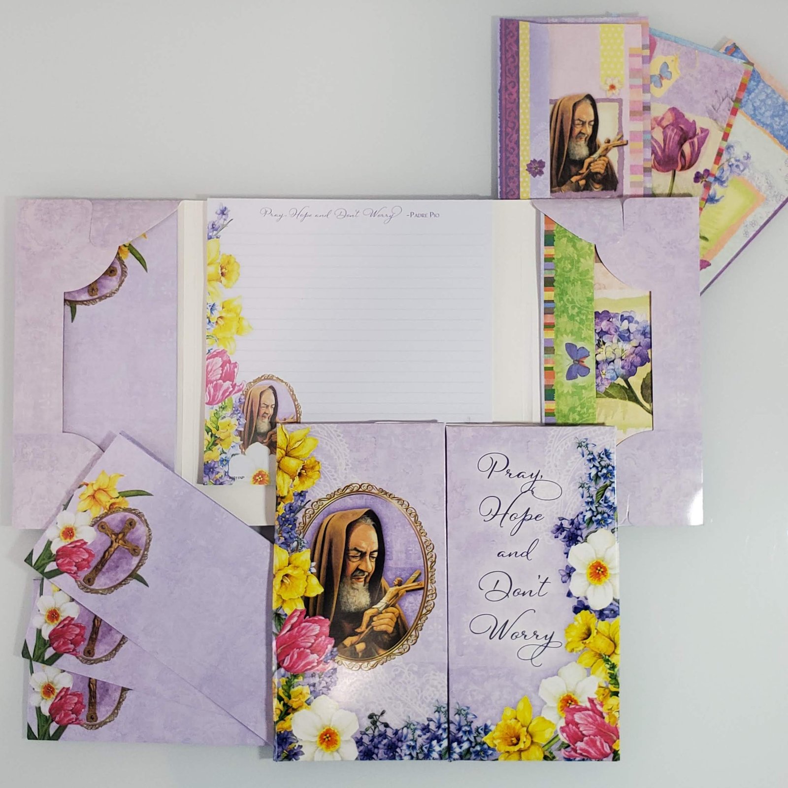 Our new Easter stationery folio featuring four greeting cards with coordinated envelopes, a pad with 14 sheets of lined paper, and eight envelopes to match the notepad pages.