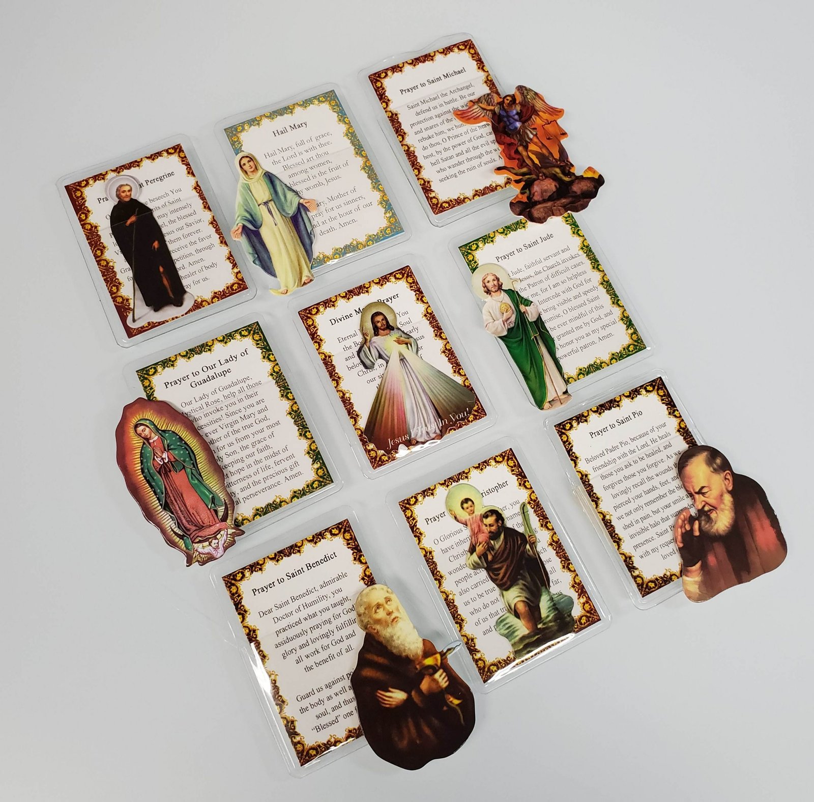 A mini pocket-sized folder that includes a prayer and cut out picture of the associated holy figure. Comes in the choice of Saint Pio and Saint Benedict.