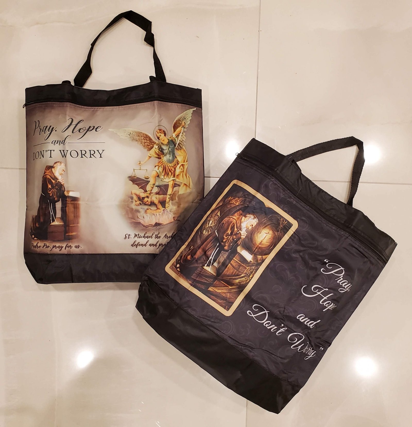 This bag is perfect for everyday use, and can be used as a gift bag or grocery bag. There is a zipper on the front and it is held closed by velcro. This beautiful tote bag comes in two styles: one has Padre Pio's famous saying "Pray, Hope, and Don't Worry" on the front next to a color picture of Padre Pio himself, and the other features color pictures of both Padre Pio and Saint Michael.