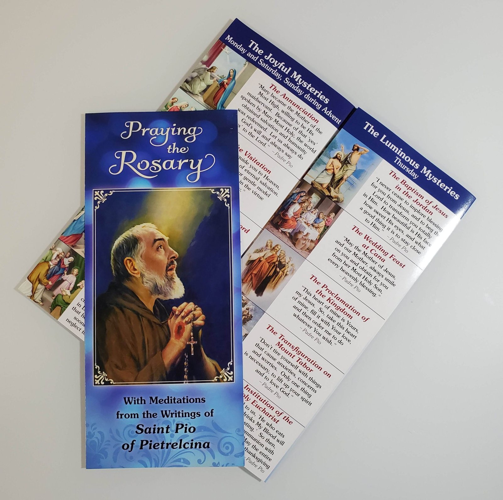 A trifold pamphlet including the Fatima and Rosary Prayers along with meditations from the writings of Saint Pio