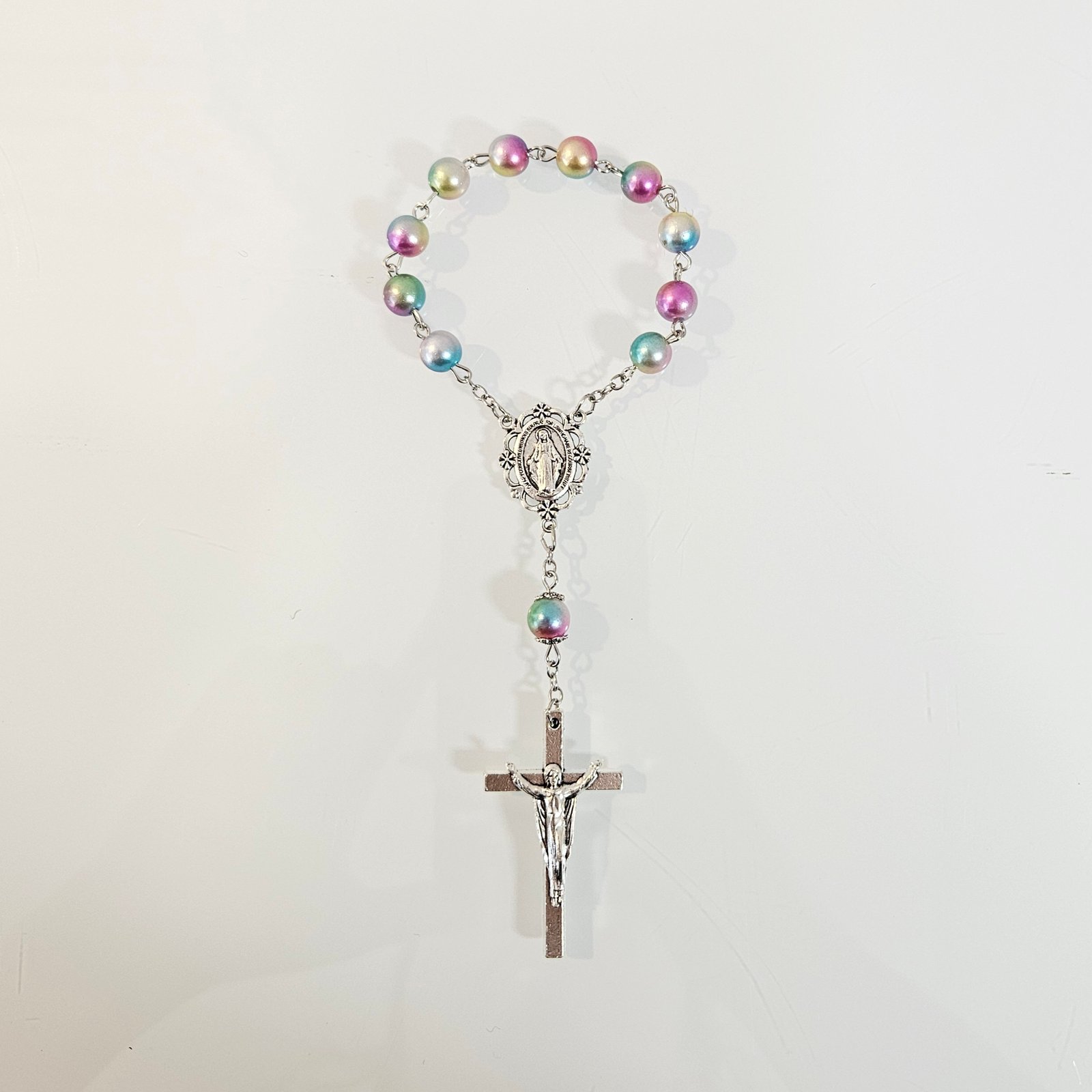 This one-decade rosary is a great tool to help reflect in the Easter season on Jesus' triumph over death. Features colorful iridescent glass beads and a double-capped Our Father bead, and a Miraculous Medal centerpiece and the Risen Christ cross.