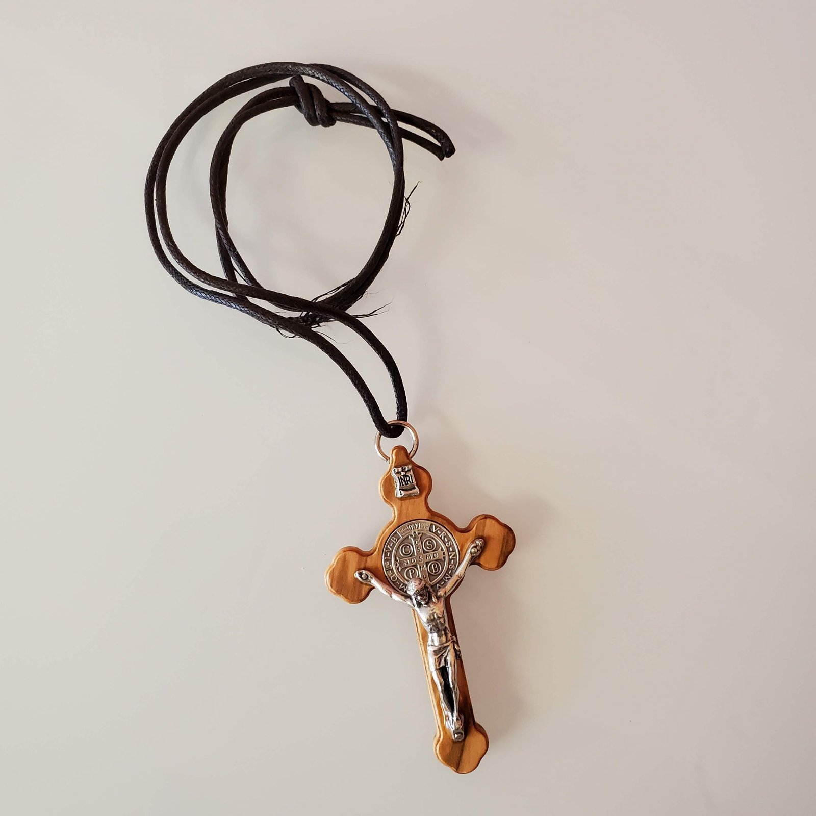Silvertone crucifix on an olive wood cross with a leather rope.