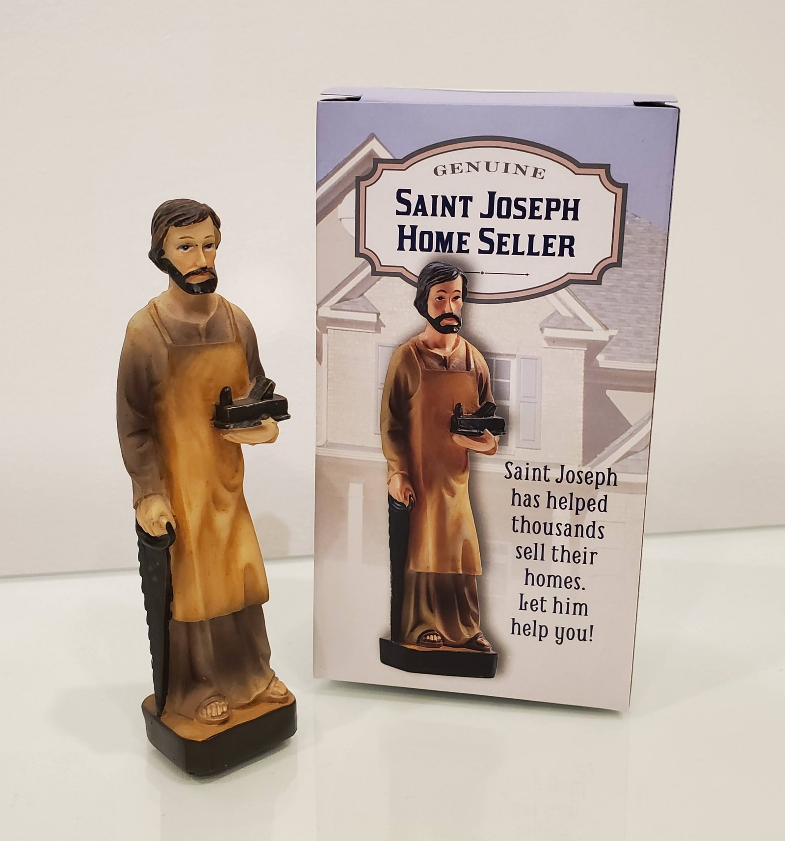 roots in the ancient Catholic custom of burying blessed medals in the ground, invoking God’s blessing on the area. Each full color gift box contains one 5” resin statue, a full color story card, and a full-color tear-off Saint Joseph holy card with the Prayer to Saint Joseph, Patron of a Happy Home on the back.