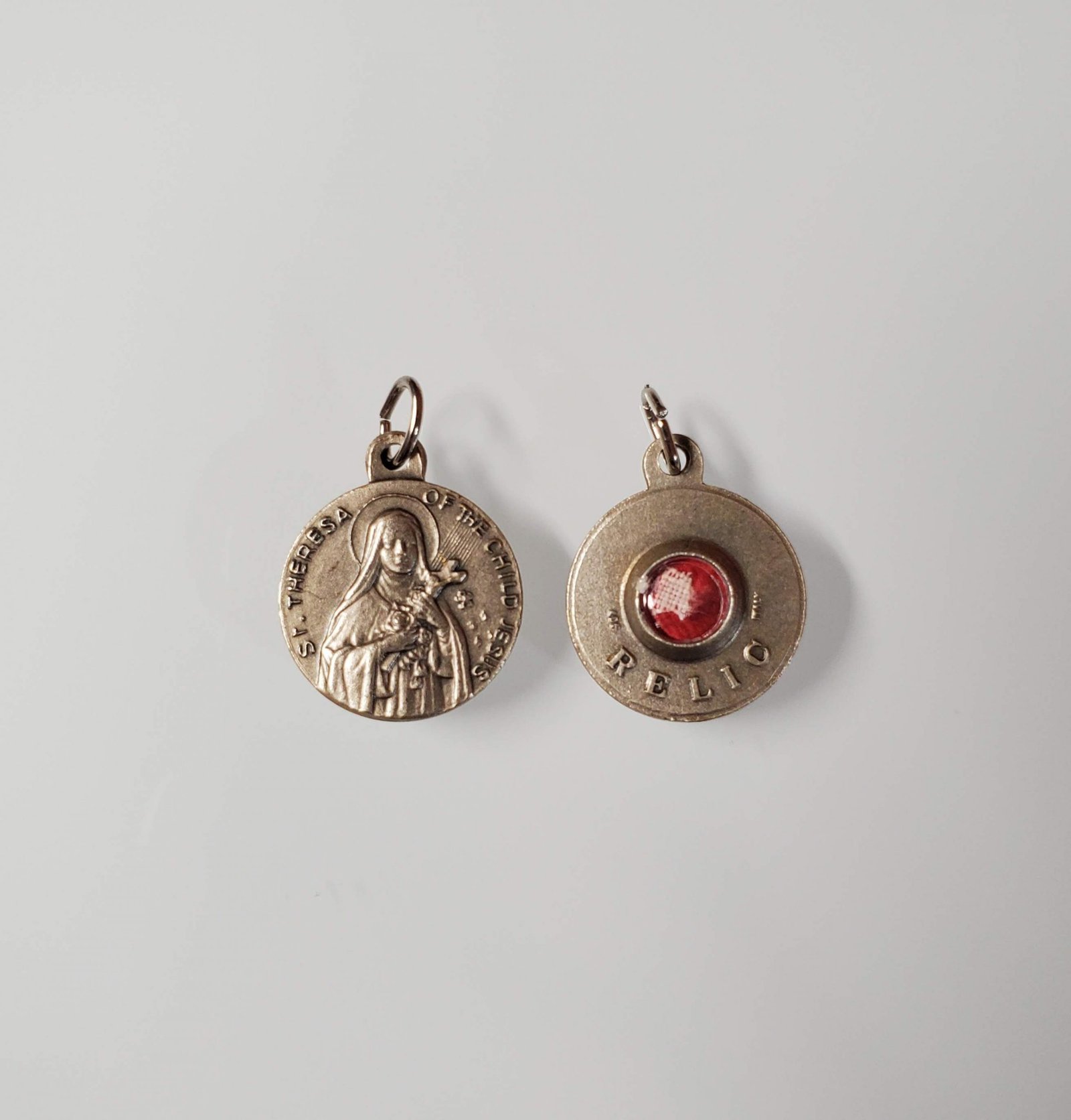 This dime-size medal has the image of Saint Theresa on the front and a 3rd class relic of her on the back.
