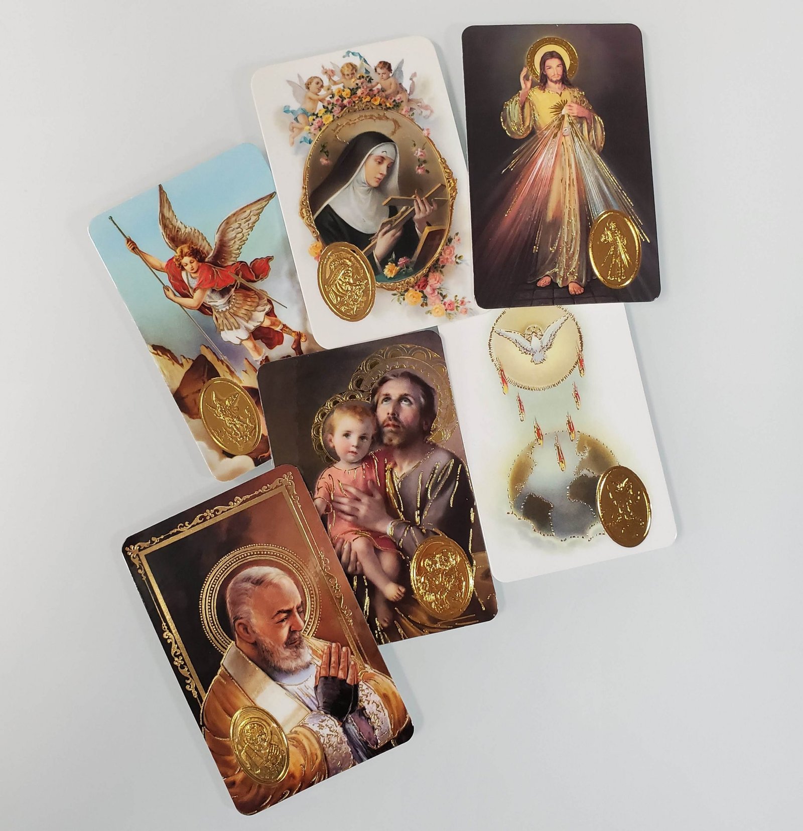 Wallet-sized prayer cards with gold accents and an embossed gold emblem. Choose from Saint Anthony, Divine Mercy, Holy Spirit, Immaculate Heart of Mary, Holy Family, Infant of Prague, Saint Joseph, Memorare, Saint Michael, Saint Peregrine, Saint Pio, and Saint Rita.